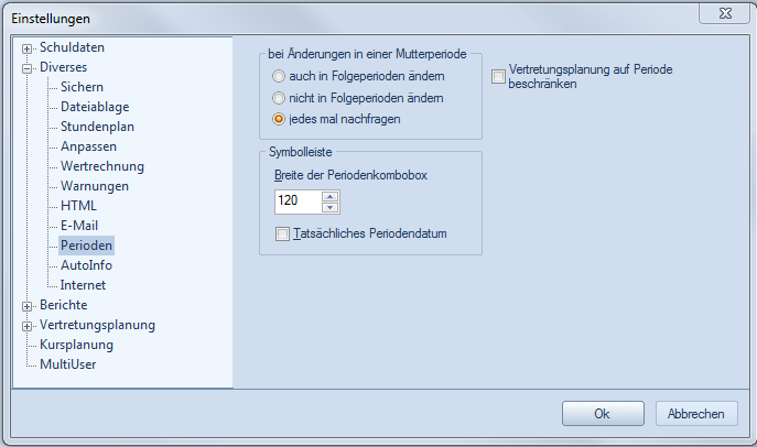 Tipp: Zu Ihrer eigenen Sicherheit und zur Sicherheit der Datenkonsistenz lassen Sie den Haken bei „bei Änderungen in einer Mutterperiode“ immer auf „jedes Mal nachfragen“ aktiv.