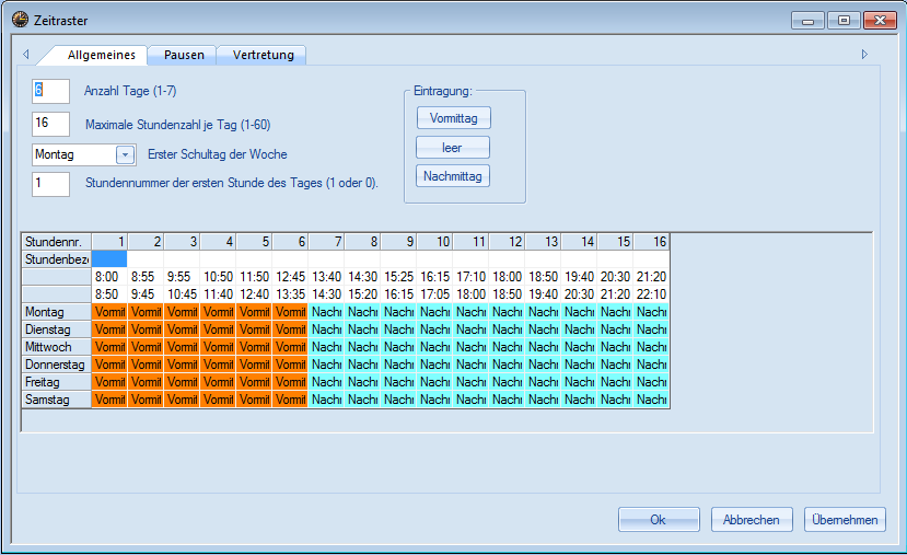 Durch die Beginn- und Endzeiten der Stunden werden auch die Pausen festgelegt.