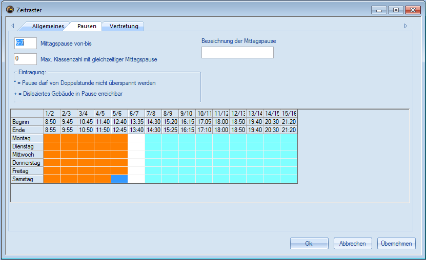 Die Karteikarte [Pausen] öffnet die Möglichkeit, Stunden der Mittagspause, Pausen, die von Doppelstunden nicht überschritten werden dürfen („+ „), Pausen in denen ein disloziertes Gebäudeerreicht werden kann („ * “) einzugeben.