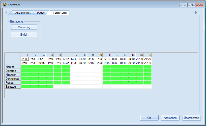 In der Karteikarte [Vertretung] geben Sie an, welche Stunden suppliert werden sollen. Dieser Raster gilt grundsätzlich für alle Klassen, doch sind Änderungen für einzelne Klassen möglich (Genaueres siehe <Klassen | Stammdaten | Klassenzeitraster: Vertretung>). Die Eingabe erfolgt entweder durch „markieren“ und auswählen der Schaltfläche oder durch Doppelklick in die betroffene Stunde.