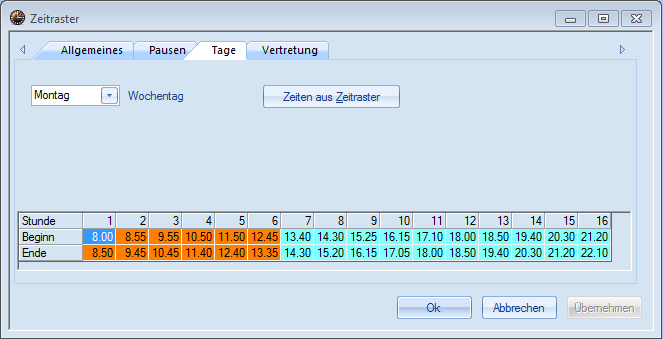 - Tageszeitraster aktivieren: Zu aktivieren, wenn für bestimmte Wochentage ein eigenenr Zeitraster gelten soll