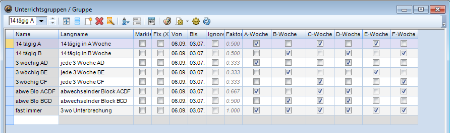- Sie können nun jeden Unterricht mit derselben Wochenperiodizität, jeden Unterricht der die gleichen Unterbrechungen aufweist, und jeden Unterricht, der dieselben Angaben hat in eine eigene Gruppe einordnen.