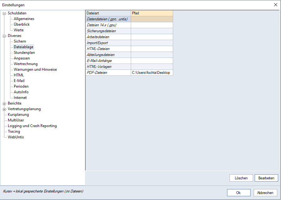- Arbeitsdateien: Beim Rechnen verschiedener Stundenpläne werden diese als Work-Dateien (workxx.untis) im angegebenen Pfad abgelegt.