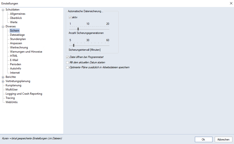 Sie geben hier die Anzahl der gewünschten Sicherungsgenerationen (werden abgelegt als save1.untis, save2.untis, …) und den Zeitabstand der Sicherungsgenerationen ein. Seien Sie hier nicht zu großzügig! D.h. anhand unseres Beispiels wird im Abstand von jeweils 10 Minuten der derzeitige Arbeitsstand abgespeichert, nach der zehnten Sicherung wird die erste wieder gelöscht.