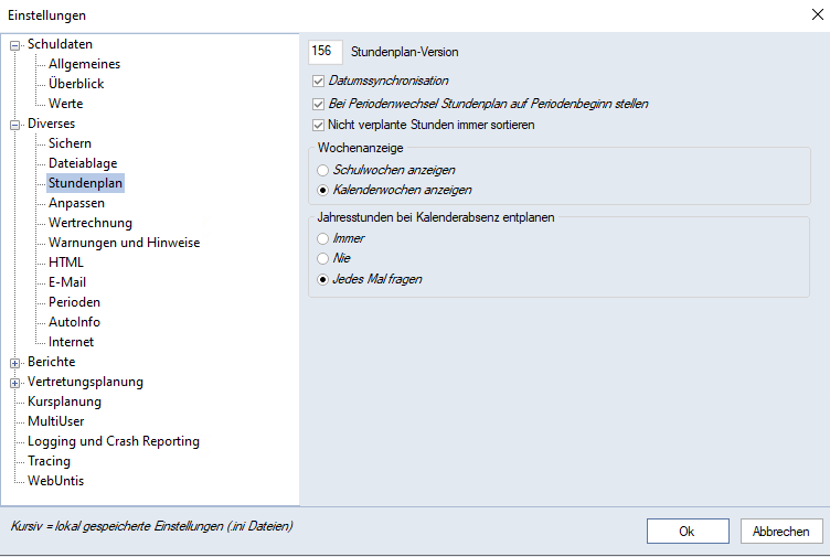 - Wochenanzeige: es kann eingestellt werden, ob die eingestellte Woche von Jahresbeginn oder von Schuljahresbeginn gezählt wird.