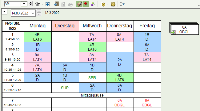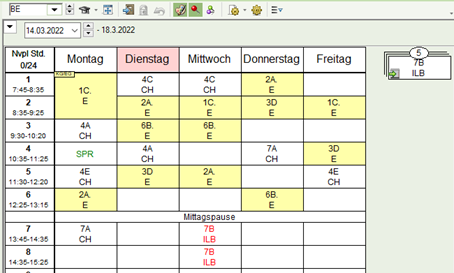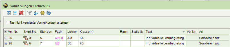 In der Vertretungsplanung wird nun eine Vormerkung mit dem Fach ILB oder QBGL angelegt und eine entsprechende Stundenanzahl vordefiniert. Anschließend können die ILB- bzw. QBGL-Stunden in den Stundenplan gezogen und somit verplant werden.
