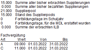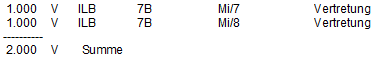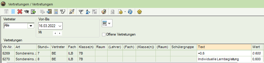 Achtung: Die Dauer einer ILB-Stunde ist mit 50 Minuten gleich einer Unterrichtsstunde. Findet eine Besprechung mit weniger als 50 Minuten statt, wird dies durch Eingabe eines Wertes im Fenster „Vertretungen“ bei „Wert“ oder „Text“ abgebildet und die Bezahlung erfolgt dann aliquot. Beispiel: ILB-Einheit mit 30min → Wert „0,600“ oder Text „=0,6“