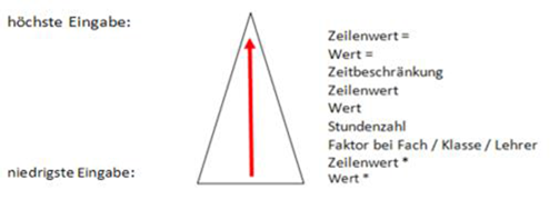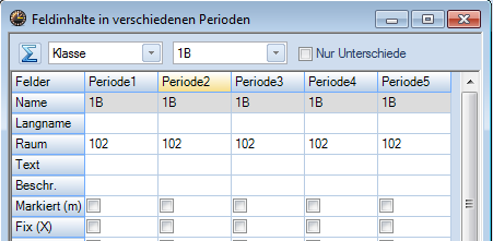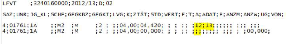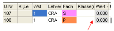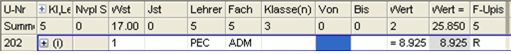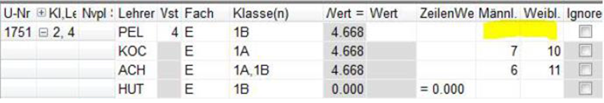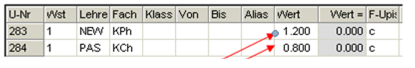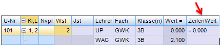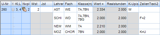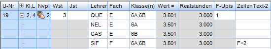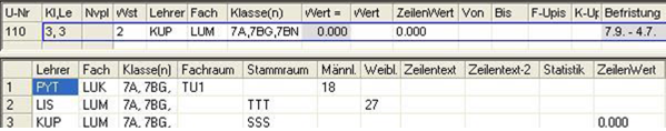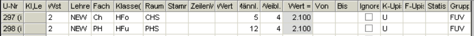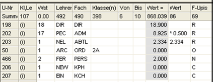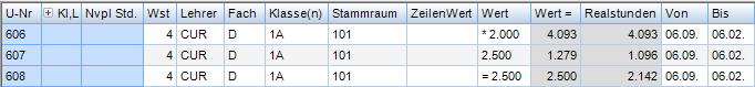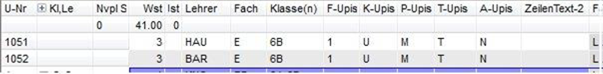 Wochenstunde, Fach, Klassen, (eventuell: von (Unterricht TT.MM), bis (Unterricht TT.MM),) Wert, Zeilenwert, Werteinheiten, U-Gruppen, Kennzeichen