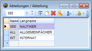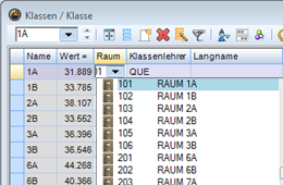 Serienänderungen bei Stammdaten sind über selektierte Bereiche möglich. Sie können z.B. bestimmte untereinander stehende Klassen in der Spalte „Abteilung“ markieren, tragen bei einer die entsprechende Abteilung ein und verlassen das Feld mit „Enter“. Nun ist bei allen ausgewählten Klassen diese Abteilung eingetragen.