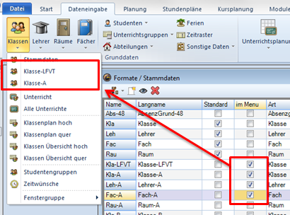 Der Aufruf für (eigene) Ansichten direkt aus <Stammdaten> kann hier hinzugefügt werden (z.B. „Klasse-LFV“ und „Abteilung“). Dazu muss in <Formate / Stammdaten> die gewünschte Ansicht im Feld „im Menü“ angehakt sein.