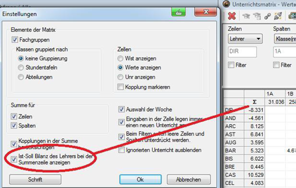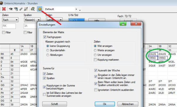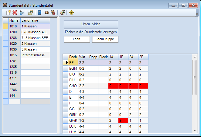 Ansichtengestaltung für die Lehrfächerverteilung