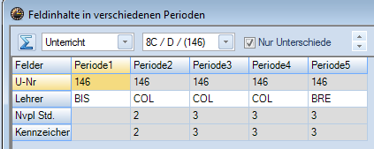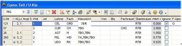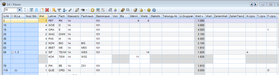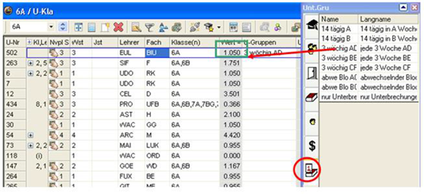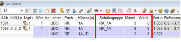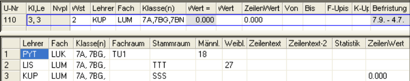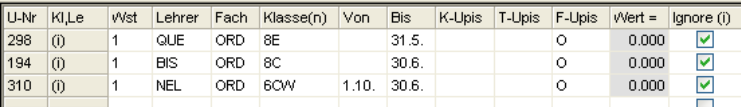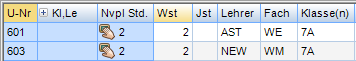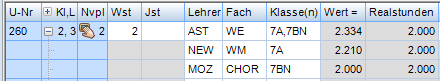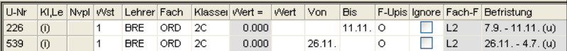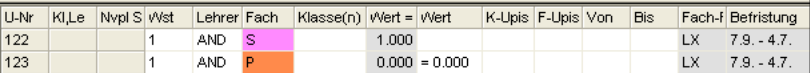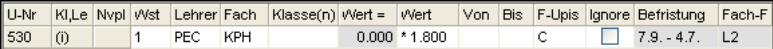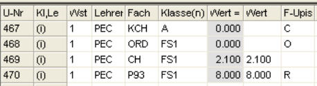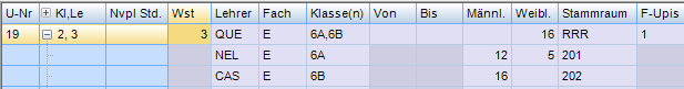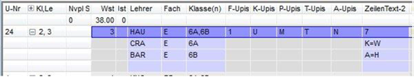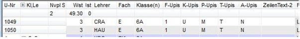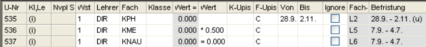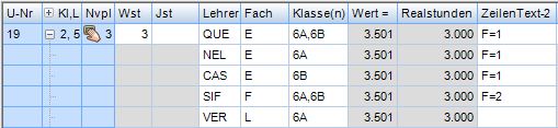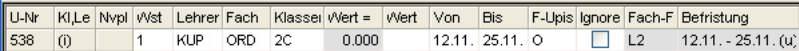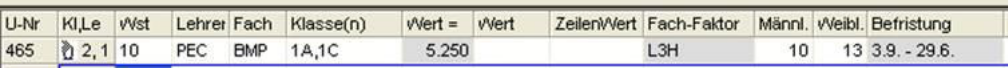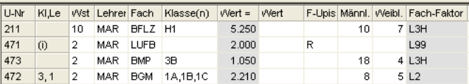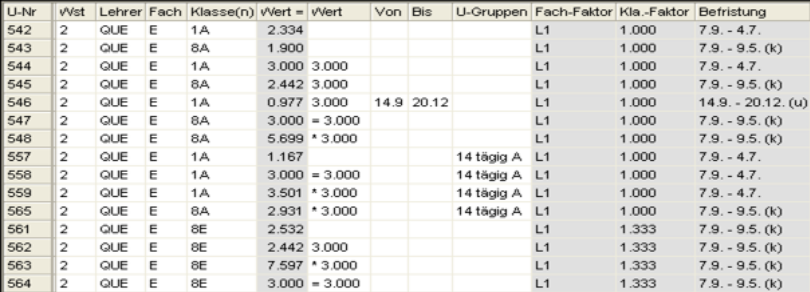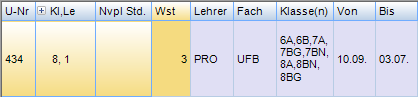 Wochenstunde, Fach, Lehrer, (eventuell: von (Unterricht TT.MM), bis (Unterricht TT.MM.),) Werteinheiten, U-Gruppen, Kennzeichen