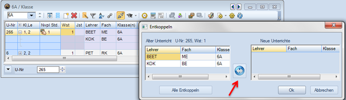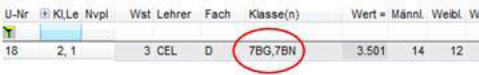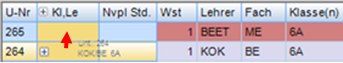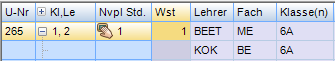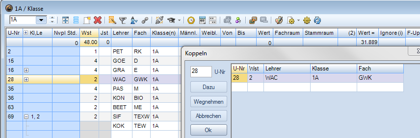 - Durch Dazuschreiben der Klassen in der Spalte Klassen (nicht vergessen, den Unterricht bei der dazugeschriebenen Klasse löschen) oder durch den Kopplungs-Button oder durch Aufeinanderziehen der Unterrichtszeilen