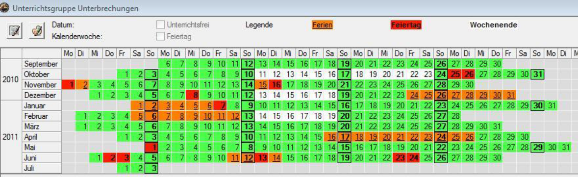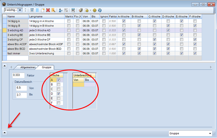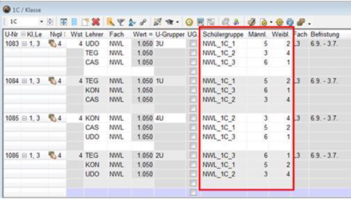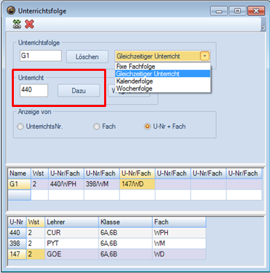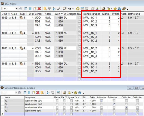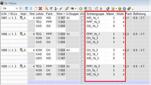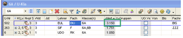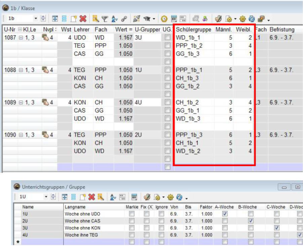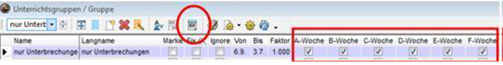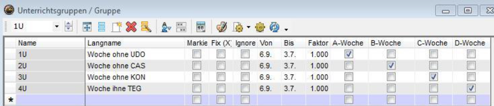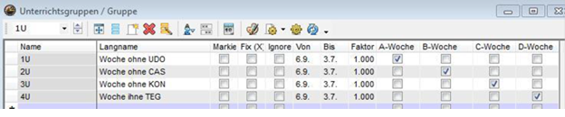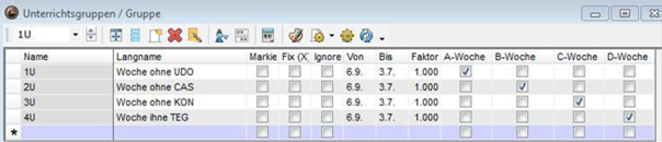 <Start | Module | Unterrichtsgruppen>(eventuell mit Unterbrechungen) und entsprechende Eintragung beim Unterricht im Feld U-Gruppe (siehe oben periodischer Unterricht)