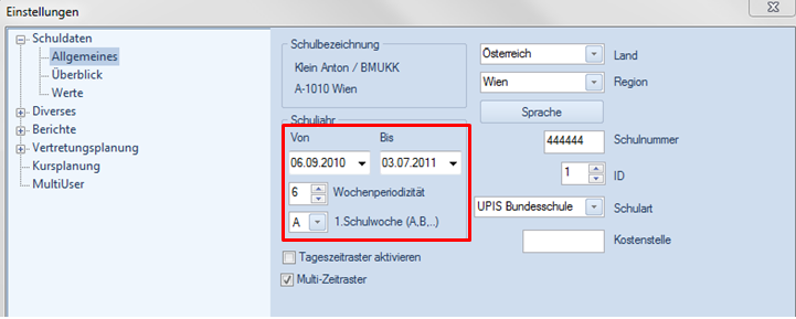 Neben der richtigen Eingabe der Lizenzdaten ist auch die Eingabe des Landes für die richtige Berechnung der Lehrfächerverteilung wichtig. Mit dem Land „Österreich“ werden die für Österreich spezifischen Felder und Berechnungsmethoden aktiviert. Die Angaben der Region (Bundesland) und des Schultyps werden momentan noch nicht ausgewertet.