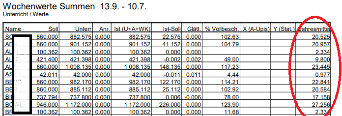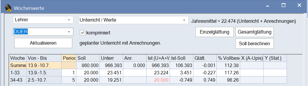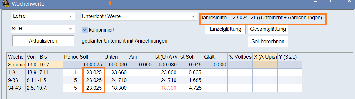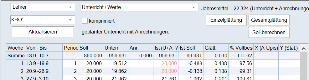 Dieser Mittelwert ist für diesen Lehrer nun der Sollwert. Dabei gehen alle Werte in die Sollwert-(Mittelwert-) Berechnung ein, die in der Glättungsperiode (Woche mit dem 5. Montag des Unterrichtsjahres) eingetragen sind.