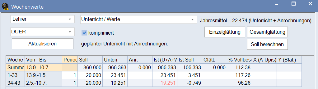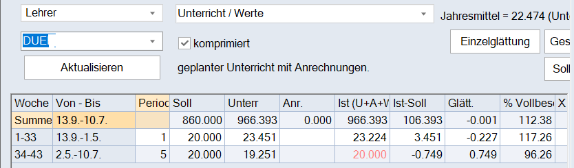 - 1.-33. Woche: 23,451 WE Unterricht. Hiervon werden 0,227 WE für die Negativ-Glättung verwendet, also dafür, um eine spätere Unterbeschäftigung aufzufüllen.