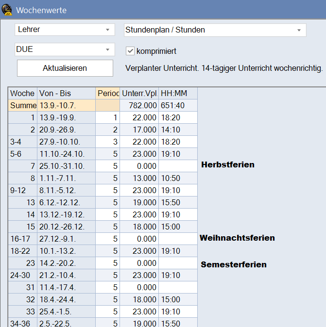 Durch Unterricht der nicht im ganzen Schuljahr stattfindet (befristeter Unterricht), sind für die LehrerInnen verschiedene Wochen unterschiedlich belegt/berechnet.