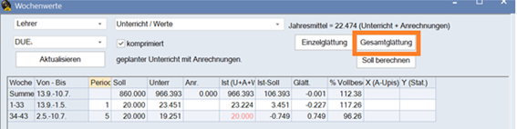 Den Button „Gesamtglättung“ für die Glättung aller LehrerInnen (globale Glättung), findet man im Menü <Module | Wochenwerte>