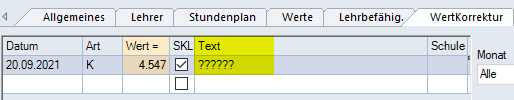 - Die Eingabe von Wertkorrekturen mit den Kennzeichen V, U, B, X, M. D soll im Regelfall nur für an Fremdschulen erbrachte Leistungen erfolgen. Die angeführten Leistungen an der eigenen Schule sollen über die Vertretungsplanung abgebildet werden und dürfen nur in Ausnahmefällen über die Wertekorrektur eingegeben werden.
