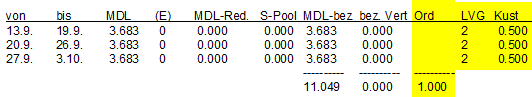 Im MDL-Vorschaublatt wird die Vergütung für das Ordinariat (Spalte „Ord“) und für die zu vergütenden Nebenleistungen (Spalte „Kust“) ausgewiesen: