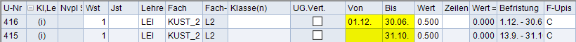 | 02 | Kontrolle Lehrer / Unterricht | • Eingaben für Ordinariate (F-UPIS=O) und Kustodiate KUST_2 und NEBL_2 (F-Upis = C) • Eintragung der Mitverwendungen • Bei Kopplung von Klassen mit ganzjährigem und verkürztem Schuljahr (Korrektur des bis-Datums in der Unterrichtszeile auf die Dauer der längsten Klasse!) |