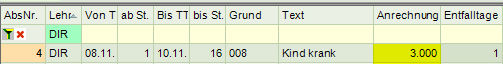 In der Spalte “Anrechnung“ steht bei allen anderen Absenzgründen der Wert 0.000!