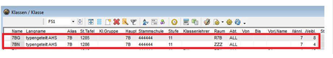Geteilte Klassen (gleiche SFKZ) werden durch verschiedene Klassennamen, die Eintragung „1“ und „2“ in der Spalte „Klassengruppe“ gekennzeichnet. Diese Zeilen müssen immer untereinander stehen.