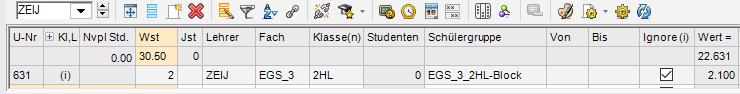 Bsp.: In der Klasse 2HL soll vom Lehrer ZEIJ 2 Stunden wöchentlich über das Schuljahr das Fach „Ernährung, Gesundheit und Sport“ (EGS_3) unterrichtet werden, jedoch soll der Unterricht 6-stündig nur innerhalb von 3 1/3 Monaten abgehalten werden.
