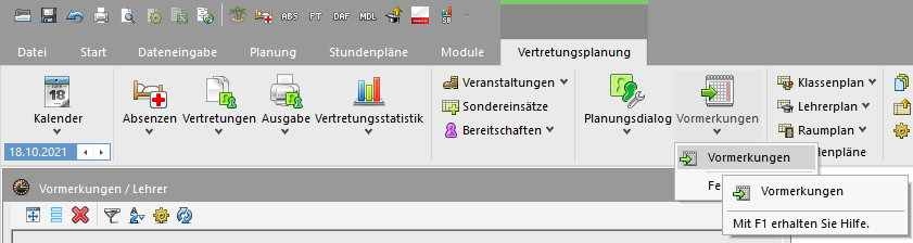 Nicht den Button „Vormerkungen“ anklicken sondern das Menü darunter öffnen. Zusätzlich zum Fenster der Vormerkungen/Lehrer öffnen Sie den Unterricht des betroffenen Lehrers/der Lehrerin (Lehrer Unterricht).