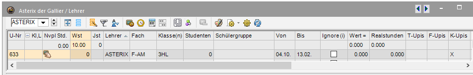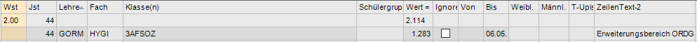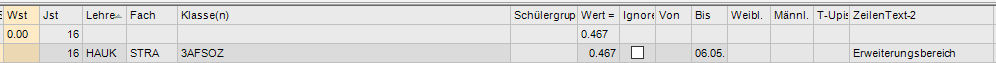 Es ist unbedingt notwendig die 0-Stunden Zeile im Unterricht des Lehrers/der Lehrerin auf 0.000 WE zu setzen. Wird dies vergessen, zählt der Unterricht doppelt! Einerseits wird der ignorierte Unterricht (ignore) in die LFV eingerechnet und andererseits würden die Vormerkungen als MDL abgegolten werden!