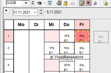 Bsp.: Lehrer GUGB möchte seine Stunde in der 5HL, die ihm am Freitag, den 5.11. entfällt, unbedingt nachholen. Auch dazu kann die Stunde zu den Vormerkungen verschoben werden.