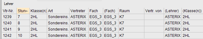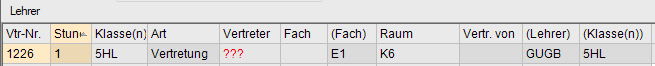Hält der Lehrer seinen Unterricht (Stunde aus den Vormerkungen), wird dies im Fenster Vertretungen Lehrer angezeigt.